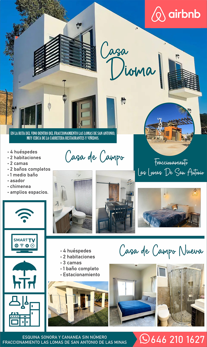 Casas de campo recien construidas, independientes y especiales para pasar un rato agradable en familia. En la ruta del vino dentro del fraccionamiento las Lomas de San Antonio en El Valle de Guadalupe, muy cerca de la carretera, restaurantes y viñedos.